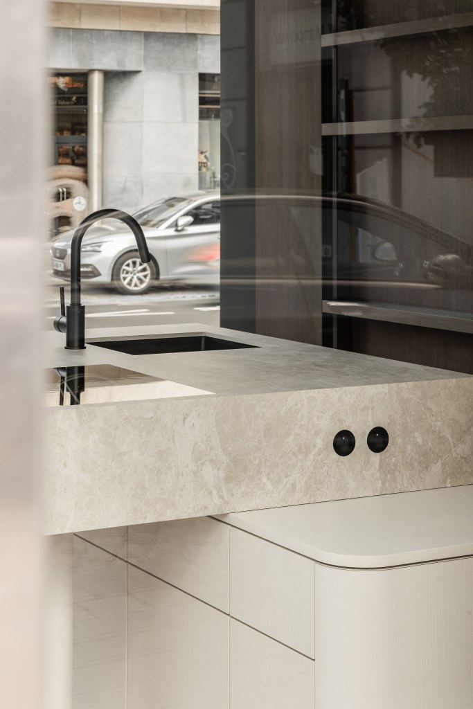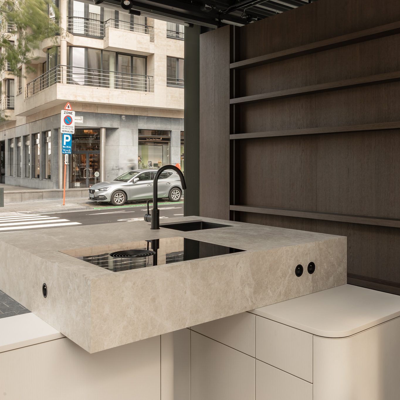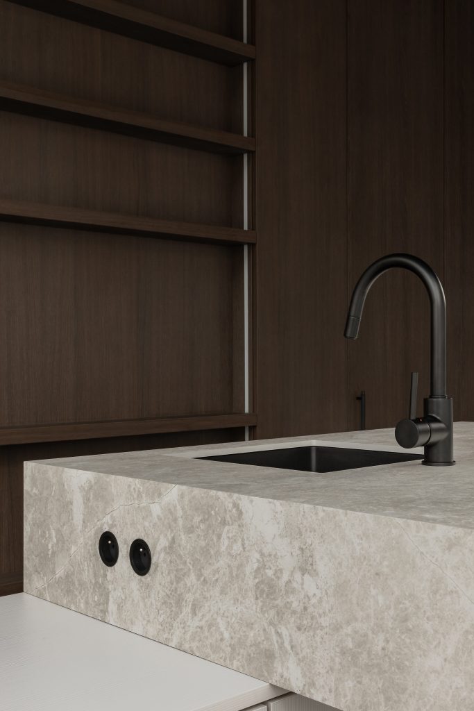 This kitchen features a massive natural stone countertop elegantly supported by two volumes containing cupboards in white oak veneer.