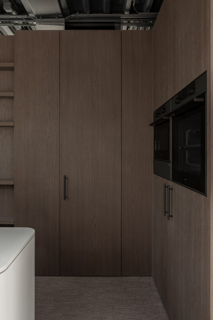 The back of the kitchen showcases high cupboards in warm walnut, combining functionality with timeless beauty.