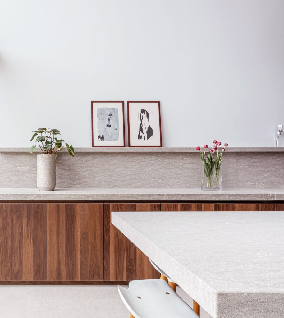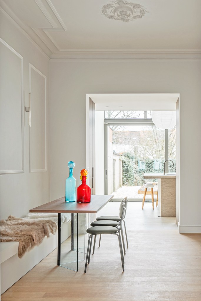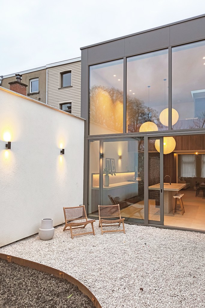 A double-height kitchen references the high interior spaces that characterize the typical interiors of Belgian townhouses. The kitchen is viewing the lush city garden and is defined as the central space to host people. The nearly 6-meter-high glass facade allows sunlight to penetrate deep into the home.
