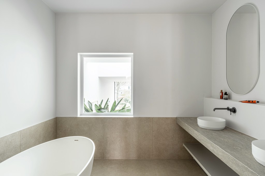 The main bathroom is replaced from the annex to the first floor. An interior window to the double height kitchen brings light into the ensuite bathroom. The floortiles are repeated on the wall on sink height to mimic the authentic paneling of the historic house.
